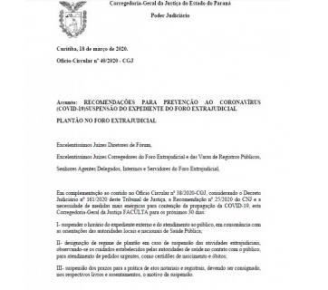 A Corregedoria Geral da Justiça do Estado do Paraná expediu no dia 18 de março de 2020 o Ofício Circular Nº 40/2020, que estabeleceu normativas e recomendações para a aplicabilidade de novas regras de expediente dos órgãos pertencentes ao Foro Extrajudicial do Paraná (cartórios de registro civil, registro de imóveis, protestos, etc), considerando a pandemia de Coronavírus (COVID-19). Nos termos da citada circular, o Corregedoria Geral de Justiça declarou a SUSPENSÃO dos serviços cartorários, em caráter FACULTATIVO, pelo período de 30 (trinta) dias, designando-se plantão para as serventias que optarem pela paralização nos atendimentos e atividades, que estarão limitando-se à pedidos urgentes, como certidões de nascimento e óbitos. Para tanto, a I.RIEDI Grãos e Insumos conta com a colaboração de todos seus clientes e parceiros, colocando-se à disposição para quaisquer eventualidades.